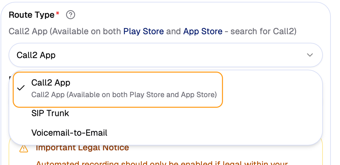 A route is where you would like the widget to send the call - this can be to your mobile phone (using the Call2 App), a SIP Trunk, AI Bot or our Voicemail-to-Email Service