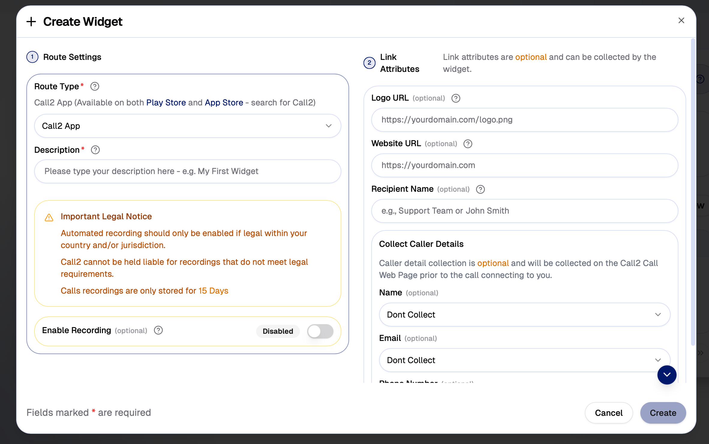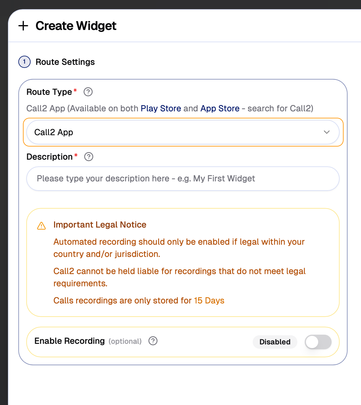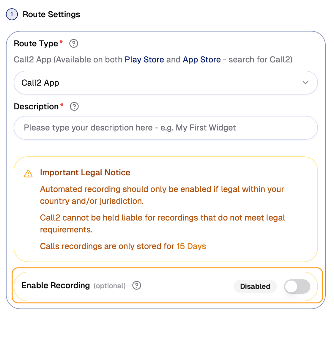 Enabling will record your incoming calls for this widget that are answered on the Call2 App. Recordings will be stored for 15 days. (Call Recordings are only available when the route type is a "Call2 App")