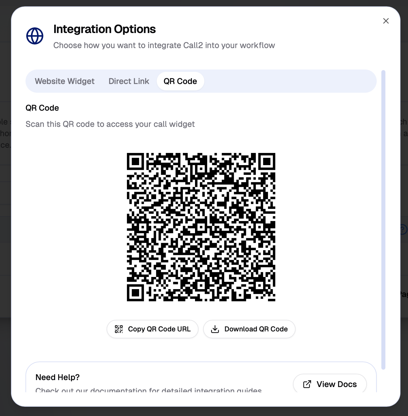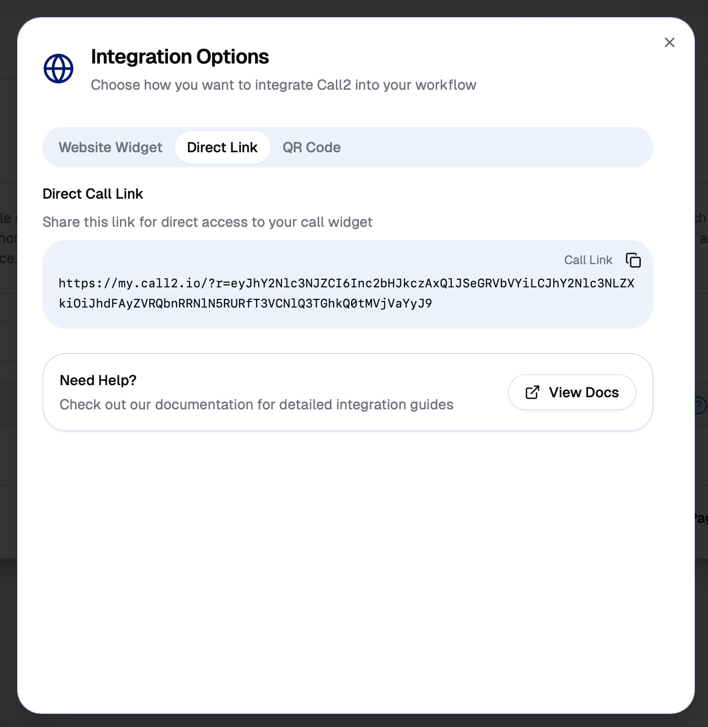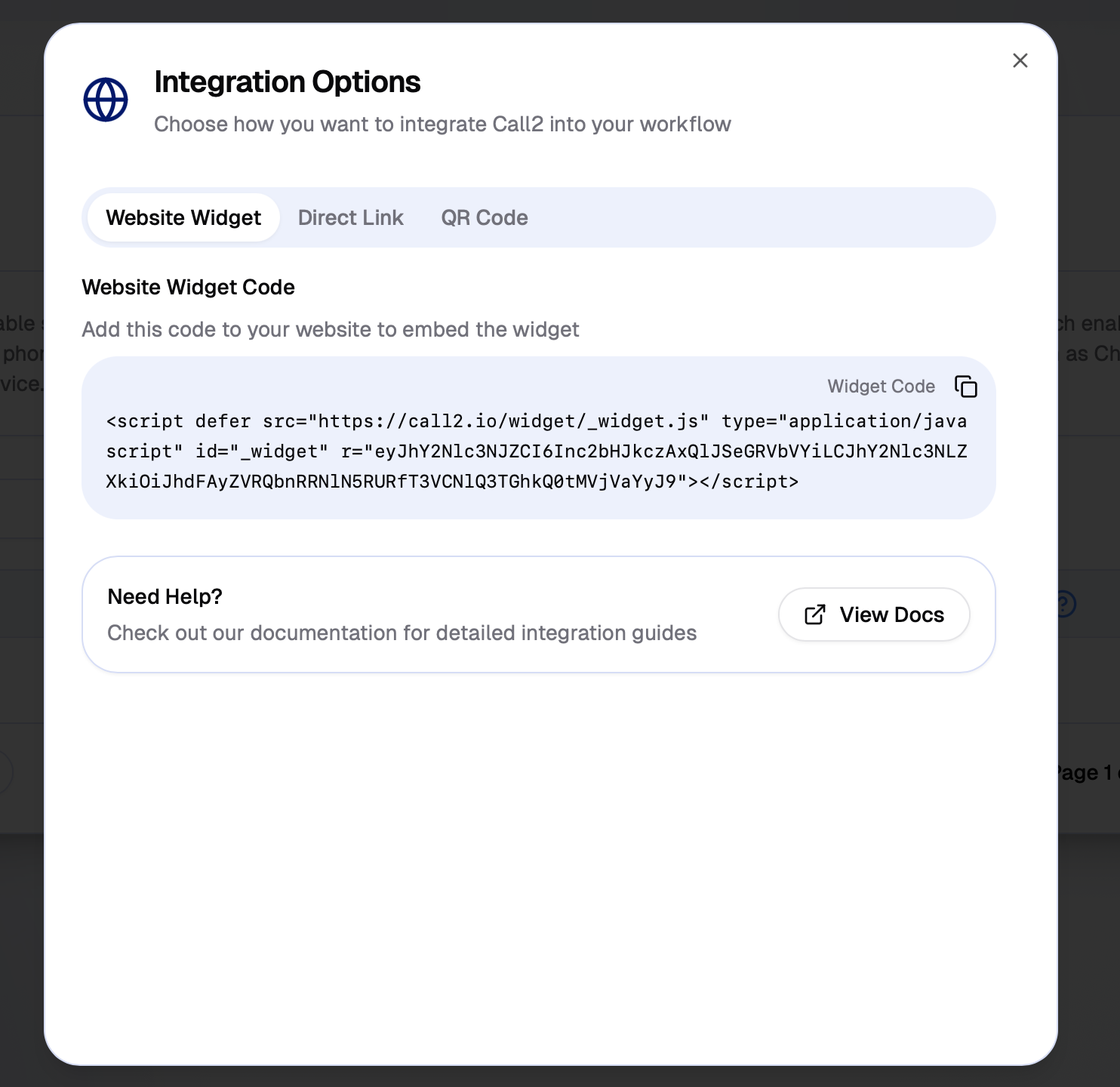 You will be presented with the "Website Widget Code", but we also provide you with "Direct Links" and "QR Code" which will both directly open up the call page for users to initiate a call.