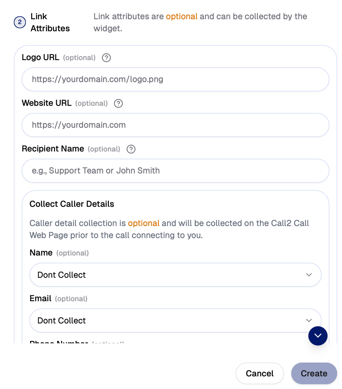 Finally, we can cover "Link Attributes" - Link Attributes are optional settings that can 1. Change the way the call page looks, or 2. Alter the requirments for making a call - such as collecting callers names, email address and/or phone numbers: